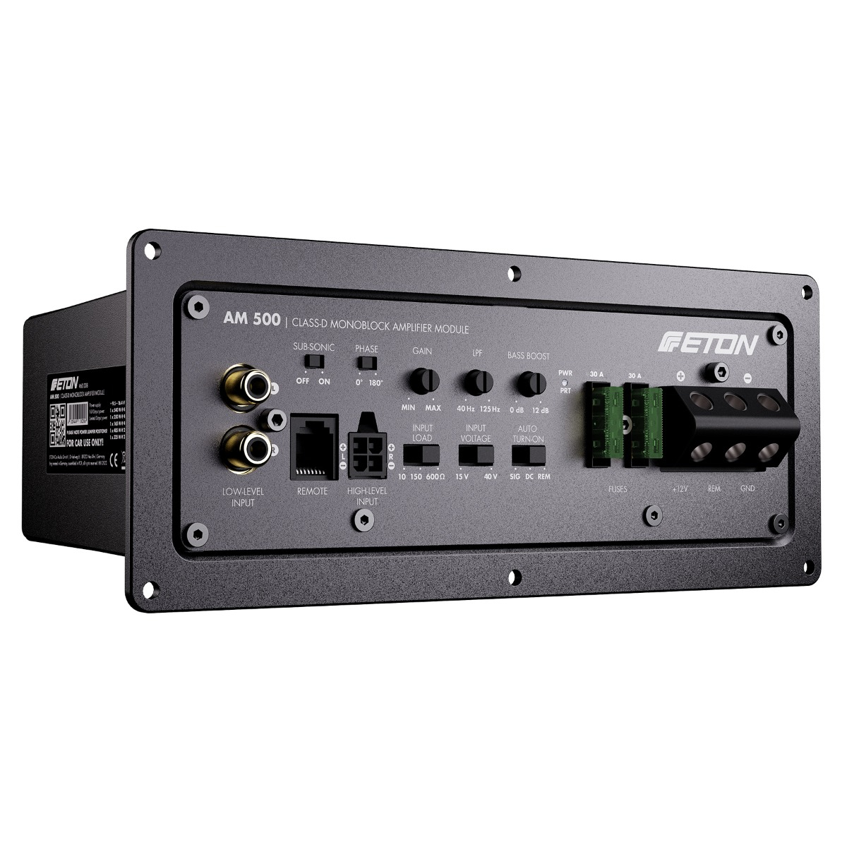 AM 500 — tai naujos kartos Class-D 1 kanalo aktyvus stiprintuvo modulis su sandziu liejinio aliuminio korpusu ir efektyviomis ausinimo briaunomis. Ismanus, pailgi korpuso matmenys leidzia patogiai montuoti net specifinese subvuferiu deziu konstrukcijose. Integruotas 3 pakopu galios ribotuvas leidzia priderinti isejimo galia pagal naudojama zemu dazniu garsiakalbi.