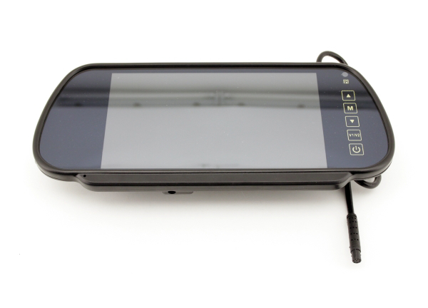 Monitorius galinio vaizdo kamerai, laidinis 7" tvirtinamas ant veidrodzio su 2 video iejimais skirtas atbulines eigos kameru, automobiliniu DVD, kitu grotuvu ar apsaugos kameru vaizdo perziurai.