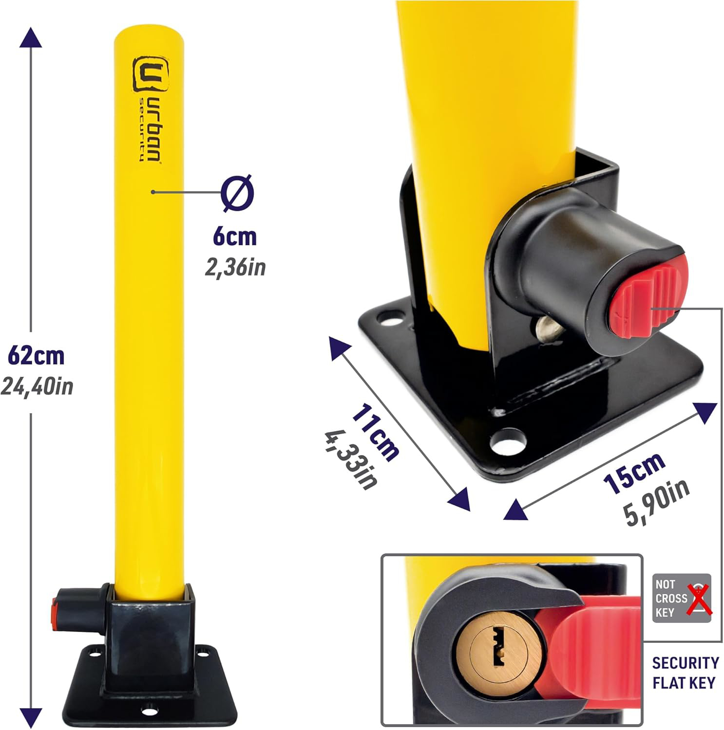 Miesto UR630 sulankstomas parkavimo stulpas su uzraktu, saugos automobiliu stovejimo aiksteles stulpas, geriau matomas, pritvirtintas parkavimo barjeras, varztai, vaziuojamosios dalies apsauginis garazo stulpas, automobilio stabdymo vietos uztvara