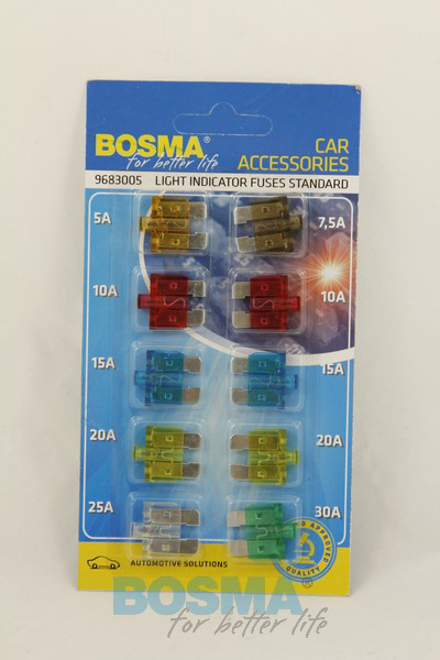 Bosma, saugikliu komplektas , 10vnt Standartiniai saugikliai su perdegimo indikacija. Komplekte: 5A, 7,5A, 2x10A, 2x15A, 2x20A, 25A, 30A Gamintojas: Bosma, EU